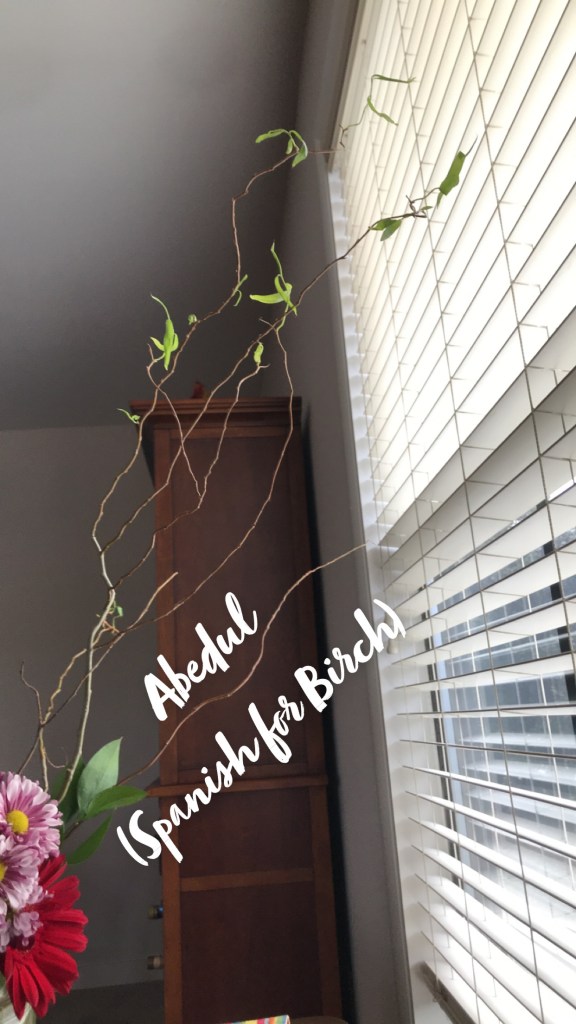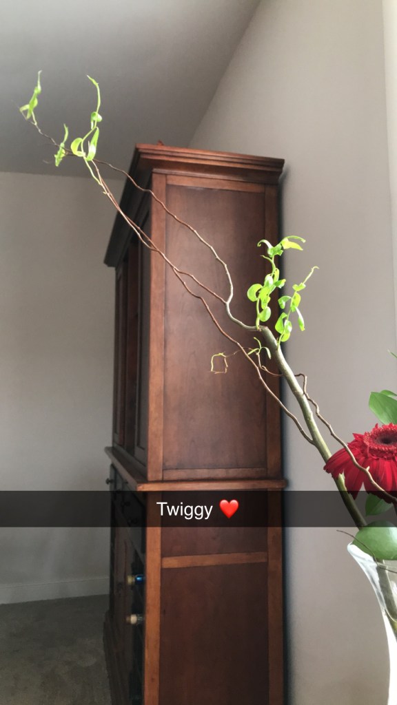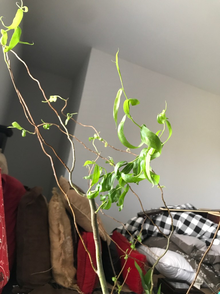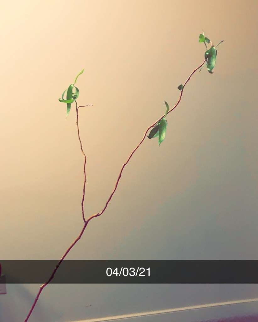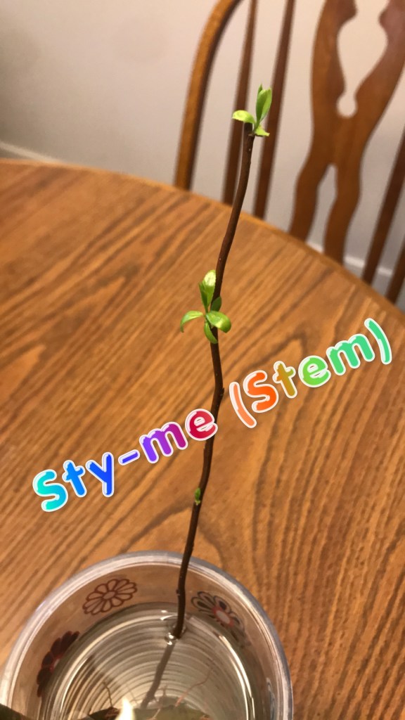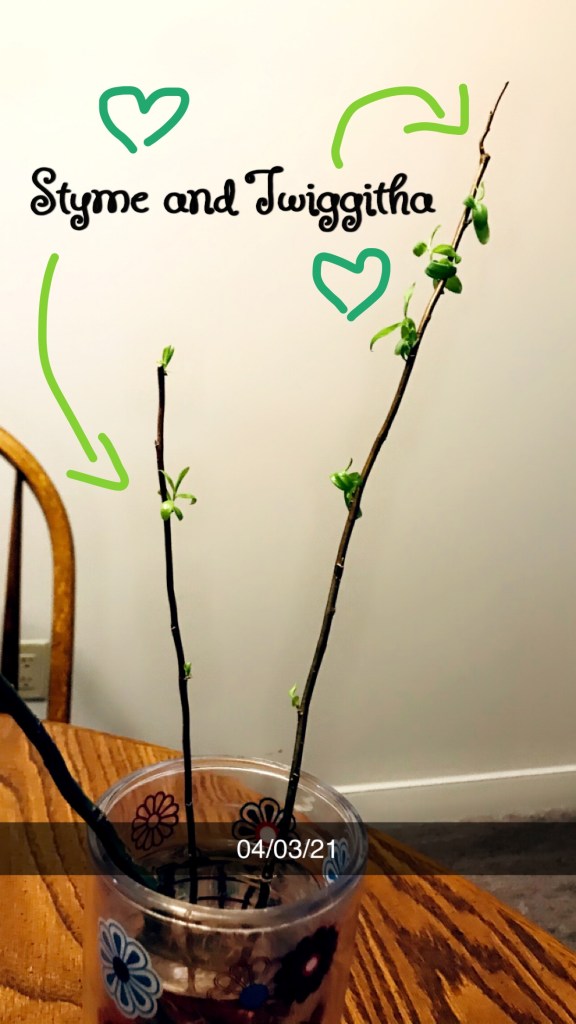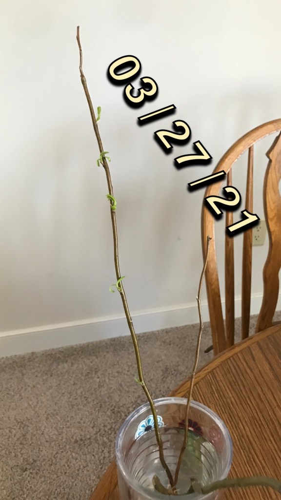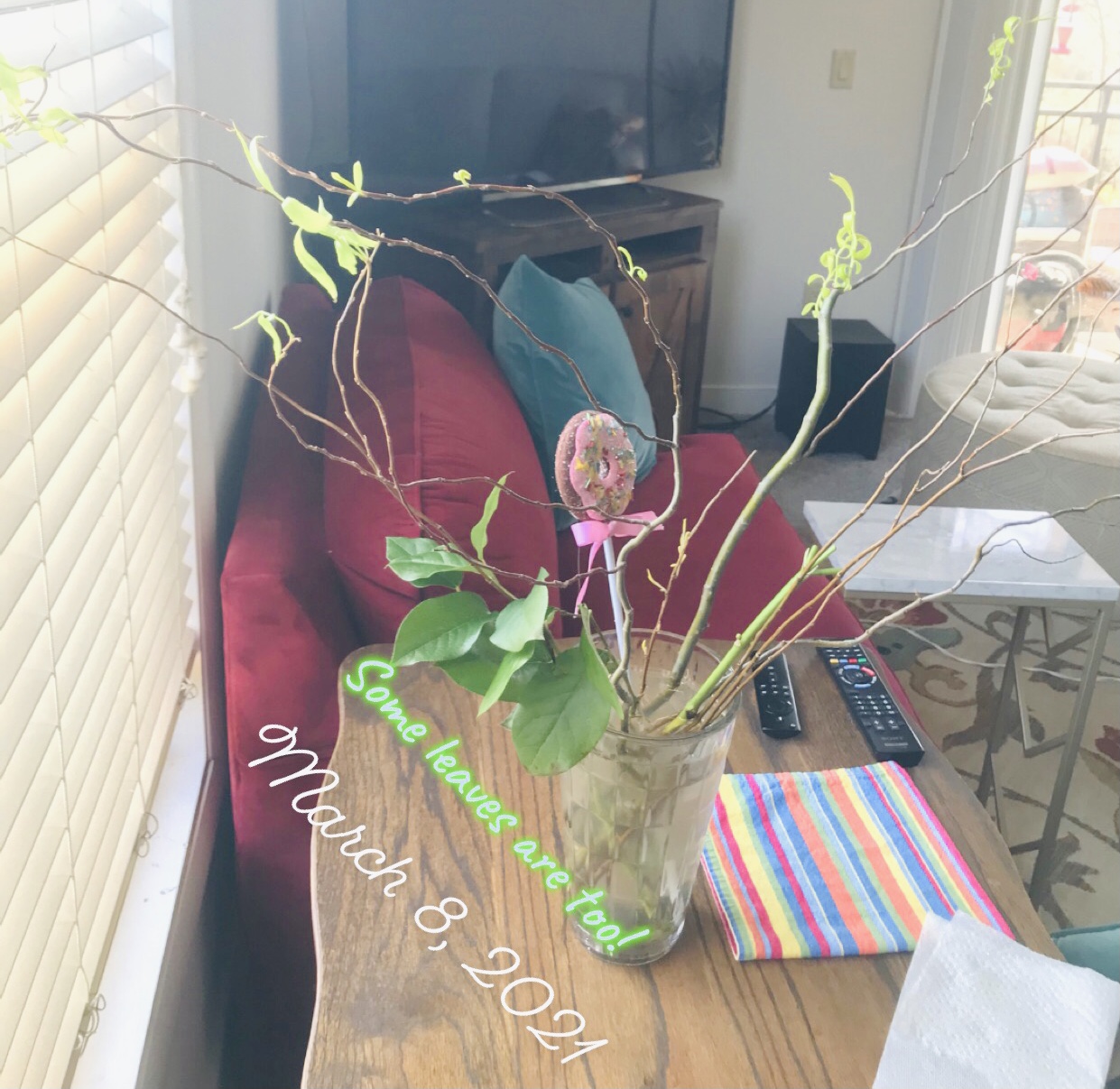 One day, several weeks after the excitement of my birthday ended, I looked over to the corner where my wilting roses sat and gasped! Green leaves! Where did they come from? Upon closer inspection I found they were growing from those decorative twigs that I had planned to throw out as soon as the last rose died. “AH! THERE’S NO SUN!” I snatched up the vase, tossed out the dead leaves/flowers, and rushed them to the nearest window.
